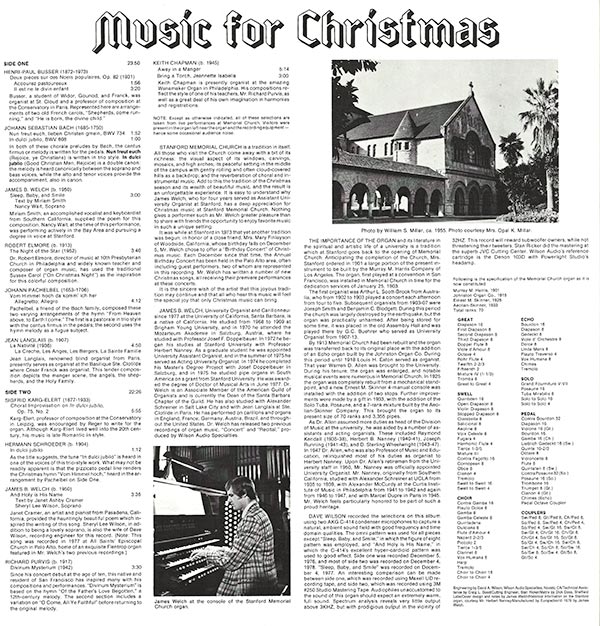 Stanford Memorial Church is a tradition in itself. All those who visit the Church come away with a bit of its richness: the visual aspect of its windows, carvings, mosaics, and high arches; its peaceful setting in the middle of the campus with gentiy rolling and often cloud—covered hills as a backdrop; and the reverberation of choral and instrumental music. Add to this the tradition of the Christmas season and its wealth of beautiful music, and the result is an unforgettable experience It is easy to understand why James Welch, who for four years served as Assistant University Organist at Stanford, has a deep appreciation for Christmas music at Stanford Memorial Church. Nothing gives a performer such as Mr Welch greater pleasure than to share with friends the opportunity to enjoy favorite music in such a unique setting.